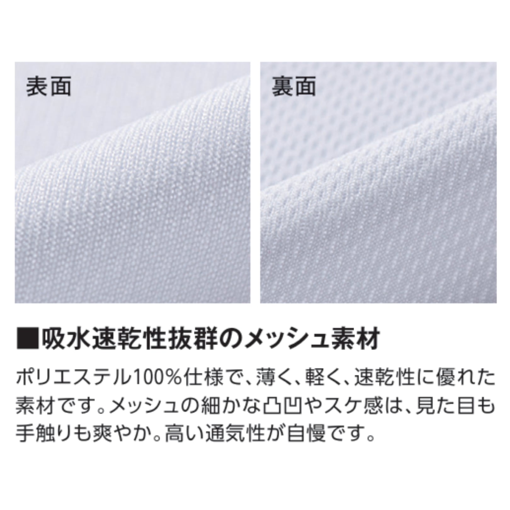 表地はフラットな編み地、肌と接地する裏面はメッシュ構造となっており、通気性と吸水速乾性を持ち、汗冷えとベタ付きを軽減します。